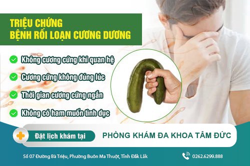 → Rối loạn cương dương: Đây là tình trạng rối loạn chức năng sinh dục nam, thường xuất hiện chủ yếu ở nam giới ngoài 40 tuổi. Triệu chứng của rối loạn cương dương là dương vật không đủ cứng hoặc cứng không đủ lâu khi thực hiện ham muốn.