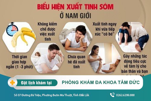 – Xuất tinh sớm là một vấn đề rất phổ biến và ảnh hưởng đến đời sống tình dục, cũng như hạnh phúc của rất nhiều nam giới. Dưới đây là một số dấu hiệu xuất tinh sớm thường gặp ở nam giới: