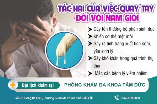 〤 Gây suy giảm sinh lý nam: Việc thực hiện quay tay thường diễn ra trong không gian kín đáo, lén lút, sợ phát hiện… nên thường được nam giới thực hiện vội vàng, tâm lý lo sợ khiến cho trung ương thần kinh hưng phấn quá độ, ức chế cảm xúc tình dục. Lâu dần sẽ hình thành phản xạ xuất tinh sớm, rối loạn khả năng cương dương, mất đi ham muốn tình dục, giảm khoái cảm khi quan hệ.