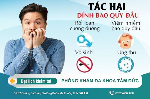 → Khi bị dính bao quy đầu bệnh nhân nên đến những cơ sở y tế chuyên khoa để được khám và điều trị kịp thời tránh gây ra những hậu quả đáng tiếc. Hiện nay tại Phòng Khám Đa khoa Tâm Đức (Số 07 Đường Bà Triệu, Phường Buôn Ma Thuột, Tỉnh Đắk Lắk) có áp dụng những phương pháp tiên tiến vào trong thủ thuật cắt bao quy đầu điều trị dính bao quy đầu hiệu quả.